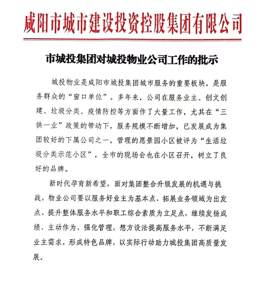 會(huì)議開始前,王雅玲宣讀《市城投集團(tuán)對城投物業(yè)公司工作的批示》。批示中指出,多年來,城投物業(yè)在服務(wù)業(yè)主、創(chuàng)文創(chuàng)建、垃圾分類、疫情防控等方面作了大量的工作,尤其在“三供一業(yè)”政策的帶動(dòng)下,服務(wù)規(guī)模不斷增加,已成為集團(tuán)較好的下屬公司之一,樹立了良好的品牌。希望城投物業(yè)在今后的工作中,繼續(xù)發(fā)揚(yáng)成績、主動(dòng)作為、強(qiáng)化管理,想方設(shè)法提高服務(wù)水平,以實(shí)際行動(dòng)助力城投集團(tuán)高質(zhì)量發(fā)展。