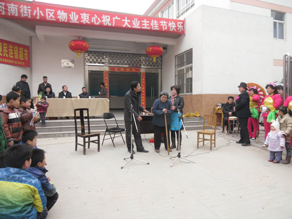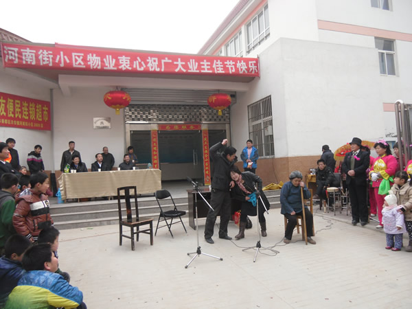 。ㄐ畔T:李建華)農(nóng)歷正月十三(2月4日),河南街小區(qū)鑼鼓喧天,彩旗招展,熱鬧非凡,呈現(xiàn)出一片祥和的節(jié)日氣氛。 上午10時聯(lián)歡會準(zhǔn)時開演,小區(qū)業(yè)主自編自演的腰鼓舞、扇子舞、拉開了這次活動的序幕,他們以優(yōu)美、歡暢的舞姿,以矯健穩(wěn)定的舞步,揮舞著手中的彩帶與鼓錘,生龍活虎,時伏時起。精彩的表演,贏得了在場觀眾的陣陣掌聲,尤其是小品《遲到的紅梅》將聯(lián)誼會逐漸推向了高潮,詼諧幽默地方話臺詞、真情再現(xiàn)的感情留露,深深的感染著在場的每一位觀眾。同時也讓我們清醒的認(rèn)識到,尊老愛幼的傳統(tǒng)美德,無論在什么時候,我們都應(yīng)該繼承與發(fā)揚(yáng),理解與關(guān)愛自己身邊的長輩與老人。 通過這次聯(lián)誼會,不但拉近與改善了物業(yè)與業(yè)主的關(guān)系,也活躍了小區(qū)精神文化生活,同時也體現(xiàn)了物業(yè)與小區(qū)業(yè)主都是一家人的魚水之情,鼓舞了物業(yè)辦全體員工繼續(xù)搞好小區(qū)各項(xiàng)工作的信心。