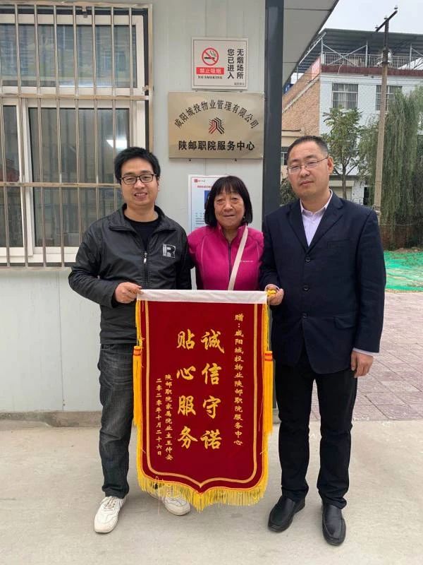 王阿姨是陜郵職院家屬院3號(hào)樓的業(yè)主。子女因?yàn)楣ぷ髅β岛苌僭谏磉,?gòu)買水電、維修等瑣碎事,都是物業(yè)人員手把手教老人如何在手機(jī)上操作。平時(shí)還幫助老人解決一些日常瑣事,老人為了表達(dá)內(nèi)心的感激之情,送來(lái)了錦旗。